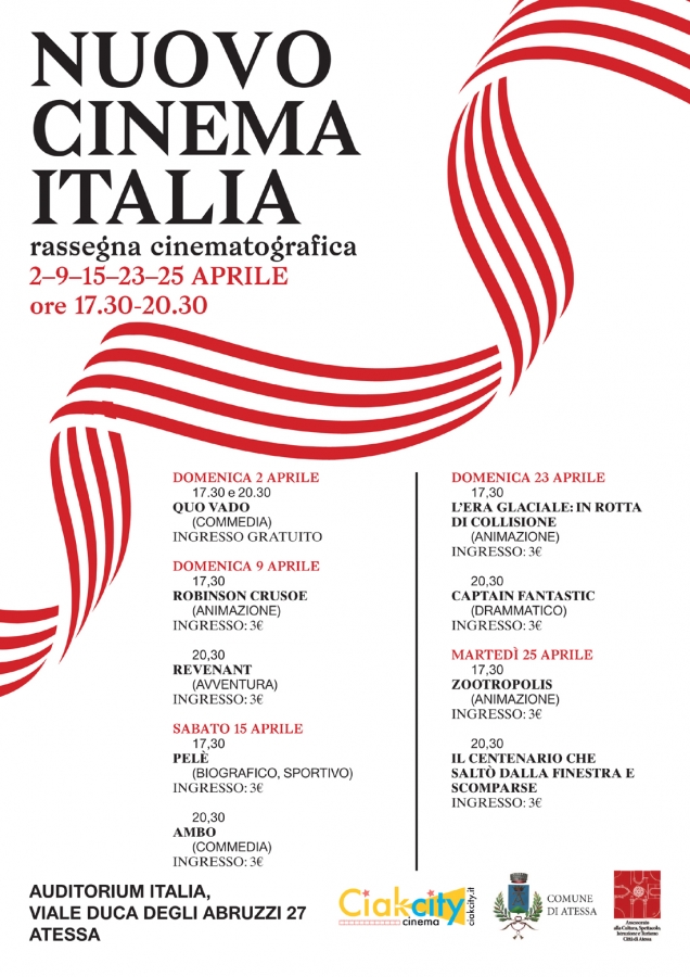 ATESSA - Prende il via la Rassegna Cinematografica "Nuovo Cinema Italia" all'interno dell'Auditorium Italia di Atessa, che vede la collaborazione tra Comune di Atessa, ed in particolare l'Assessorato alla Cultura, e CiackCity Cinema.