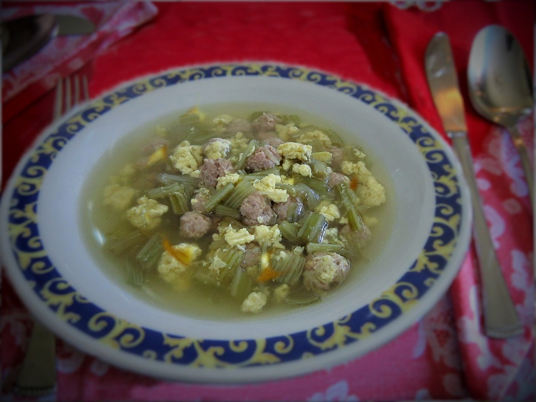 In una ciotolina battere le uova con il formaggio, aggiungere il cardone e riportare il brodo passato a bollore unendovi il mix appena fatto insieme alle polpettine, salando a piacimento.