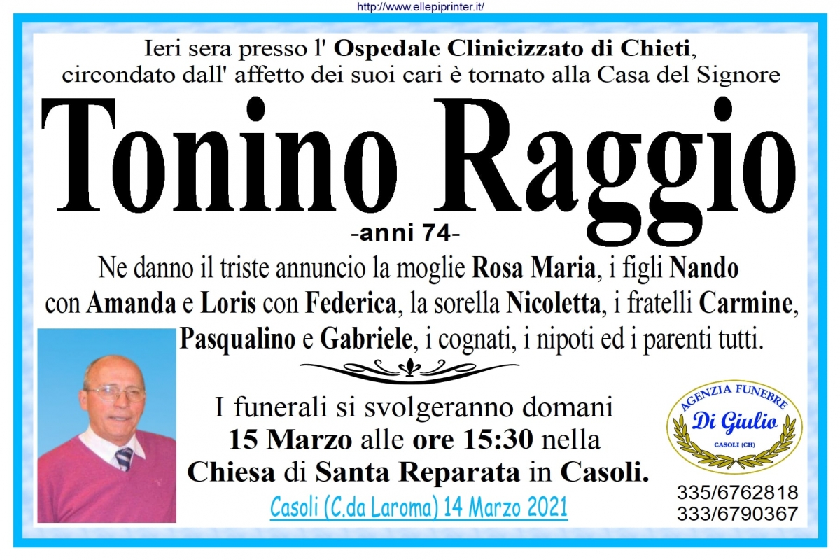 Ieri sera è venuto a mancare, all’età di 74 anni, Tonino Raggio, presso l’ospedale “SS. Annunziata” di Chieti. Lascia la moglie Rosa Maria e i due figli Loris e Nando.