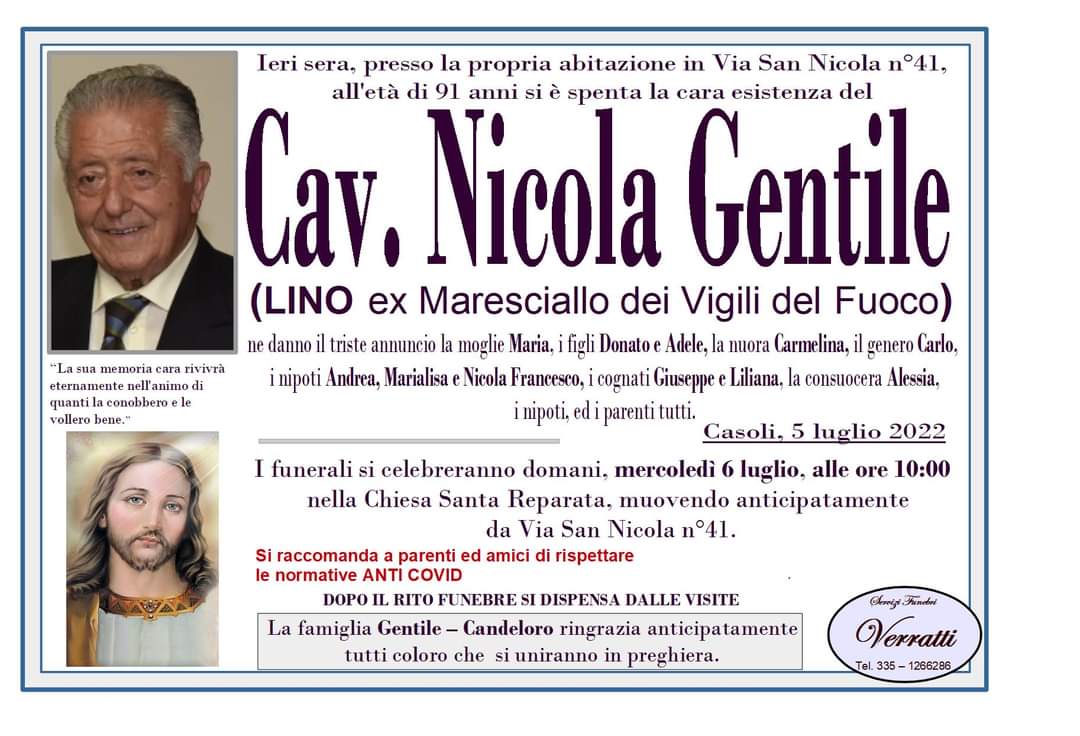 Oggi, martedì 5 luglio, nella propria abitazione è venuto a mancare all'età di 91 anni il Cavaliere Nicola Gentile.
