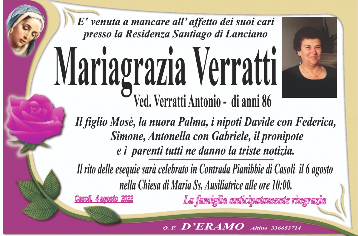 Oggi, venerdì 5 agosto 2022, è venuta a mancare all’affetto dei suoi cari Mariagrazia Verratti all’età di 86 anni.