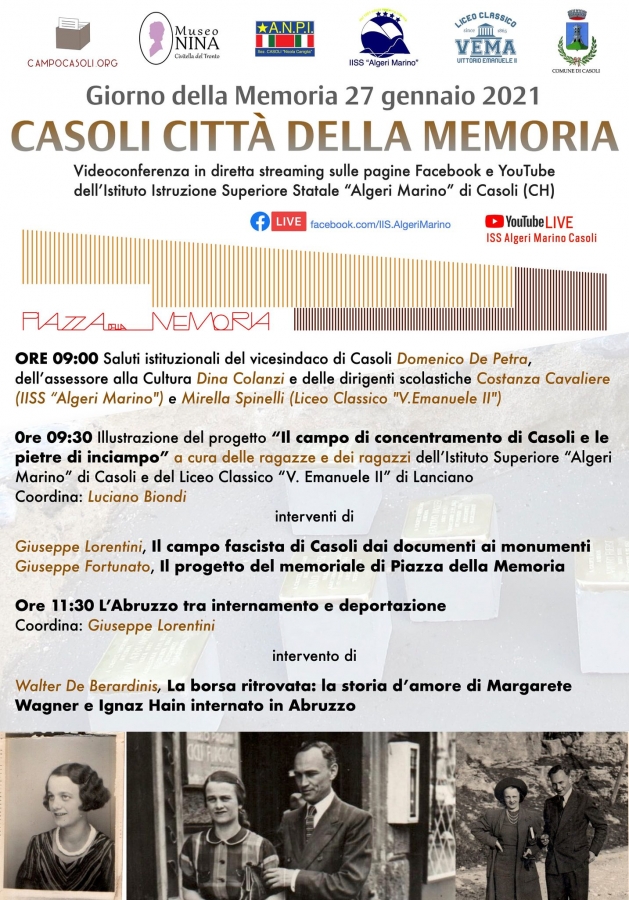 Si terrà, in occasione del giorno della memoria, una videoconferenza dal titolo “Casoli città della Memoria” nata dalla collaborazione del Comune di Casoli con l’Istituto Istruzione Superiore Statale “Algeri Marino” di Casoli e con il Liceo Classico “V. Emanuele II” di Lanciano.