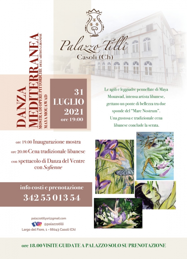 Il tutto prenderà il via con l’inaugurazione della mostra di pittura, intitolata “Danza Meditterranea” dell'artista libanese Maya Mouawad, seguita da una cena tradizionale libanese, servita sull’incantevole terrazza della storia dimore ed, infine, uno spettacolo di danza del ventre.
