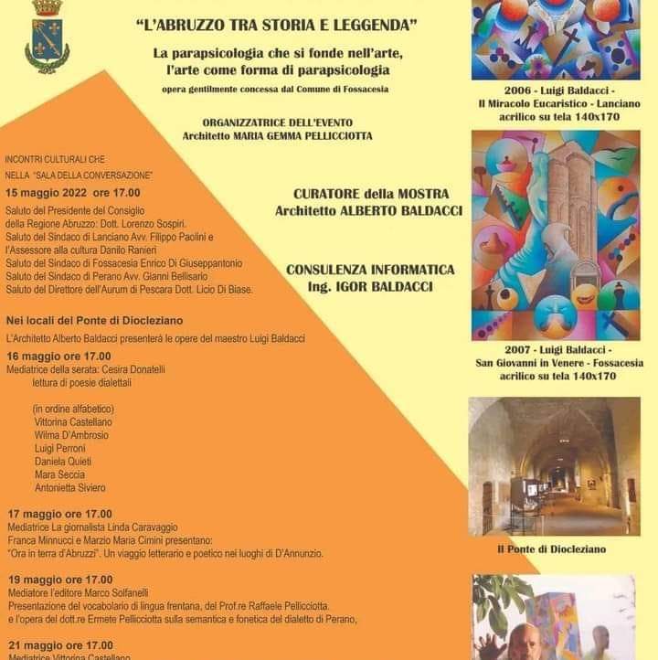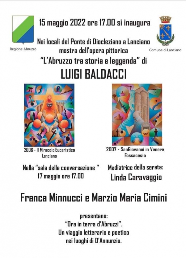 È iniziata la mostra d'arte pittorica dal titolo “L’Abruzzo tra storia e leggenda”, curata da Alberto Baldacci con il supporto informatico di Igor Baldacci, sarà aperta al pubblico dal 15 al 23 maggio 2022 nei locali del Ponte di Diocleziano a Lanciano.