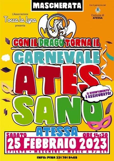 Il paese di Atessa si sta preparando per il grande ritorno del Carnevale, la festa più colorata e fantasiosa dell'anno. Sabato 25 febbraio l'Associazione culturale "Tocca la Luna", con il patrocinio del Comune di Atessa, organizzerà la prima edizione invernale post covid, un intero pomeriggio di divertimento per ogni età .
