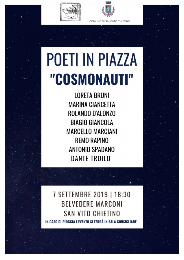 Si svolgerà sabato 7 Settembre alle ore 18.30, nel suggestivo scenario del Belvedere Marconi di San Vito Chietino, l’evento Poeti in Piazza “Cosmonauti” promosso dal Centro Studi di Lettura Parco Eremo d’Annunziano e patrocinato dal Comune di San Vito Chietino.