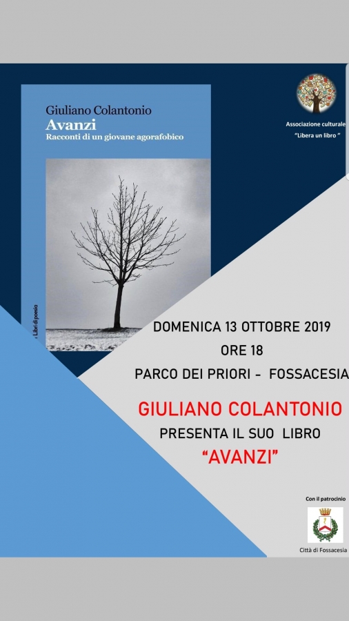 Oggi pomeriggio, alle ore 18.00, nello splendido scenario del Parco dei Priori a Fossacesia, l’Associazione Libera un Libro di Fossacesia, presenta il libro “Avanzi. Racconti di un giovane agorafobico” di Giuliano Colantonio, una raccolta di racconti poetici, privi di punteggiatura. L’evento, patrocinato dal Comune, è una delle tante attività promosse dall’Associazione, presieduta da Nicoletta Tiezzi, con lo scopo preciso di promuovere la cultura e soprattutto l’amore per la lettura. Il libro si muove all’interno del malessere del protagonista, Ludovico, impossibilitato ad uscire fuori da quattro mura, perché ciò che vi è nel mondo lo rende indifeso. Da dentro la stanza Ludovico racconta ciò che vede, la distorsione del mondo, in un susseguirsi di parole e pensieri.