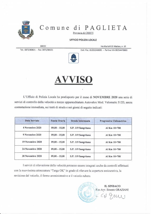 Il comune di Paglieta ha pubblicato il calendario dei controlli della velocità che la polizia municipale ha predisposto nel mese di novembre
