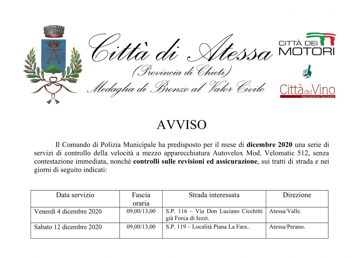 Il comune di Atessa ha pubblicato il calendario dei controlli della velocità che la Polizia municipale ha prediposto nel mese di Dicembre.