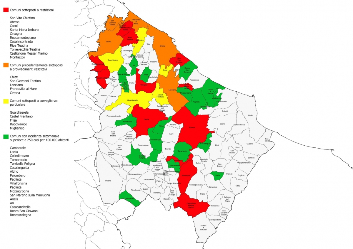 La decisione è stata assunta nella riunione avvenuta questa mattina del tavolo permanente istituito dal il prefetto di Chieti, Armando Forgione, a cui hanno partecipato il presidente della provincia di Chieti, Mario Pupillo, i sindaci dei comuni entrati in zona rossa, il primo cittadino di Chieti, Diego Ferrara, il direttore generale della Asl Lanciano-Vasto-Chieti, Thomas Schael, e i rappresentanti delle forze dell’ordine.