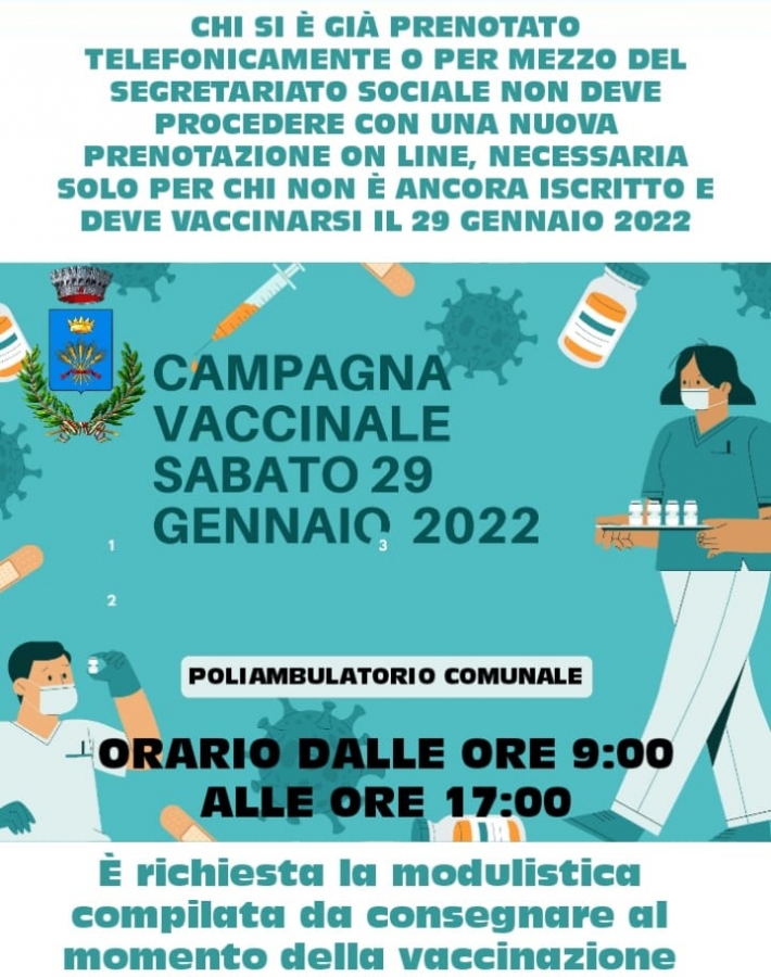 Per aderire alla campagna vaccinale del 29 gennaio è necessaria la prenotazione, dalla quale sono escluse le persone che già in precedenza hanno prenotato la dose di vaccino allo sportello del segretariato sociale di Paglieta, o telefonicamente.