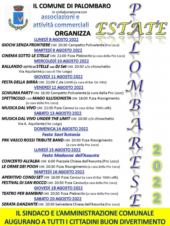 Il calendario prenderà il via lunedì 8 agosto con Giochi senza frontiere, promossi dalla Proloco Palombaro, presso il Campetto Polivalente alle ore 20:30.