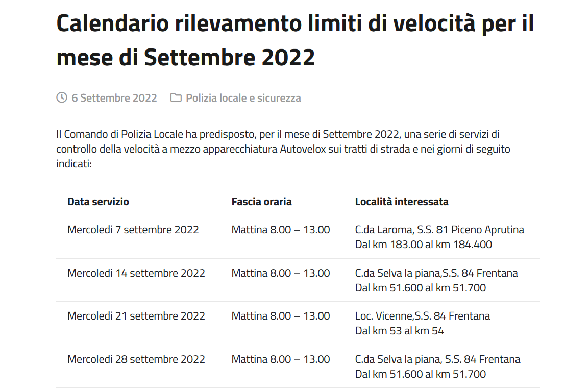 Il comune di Casoli ha pubblicato il calendario dei controlli della velocità, predisposti dalla polizia locale, per il mese di Settembre nel territorio comunale