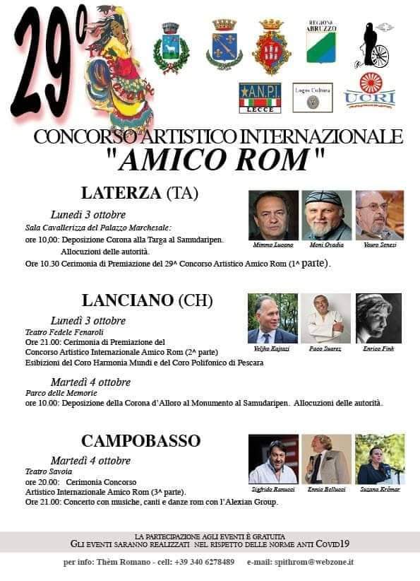 Il 3 e 4 ottobre la 29^ edizione del Concorso Artistico Internazionale "Amico Rom" a Laterza (Taranto), a Lanciano (Chieti) e a Campobasso.