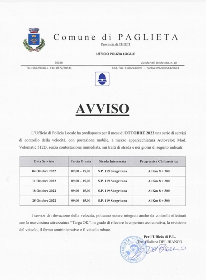 Il comune di Paglieta ha pubblicato il calendario dei controlli della velocità che la Polizia municipale ha predisposto nel mese di ottobre 2022 sulla S.P. 119 Sangritana.