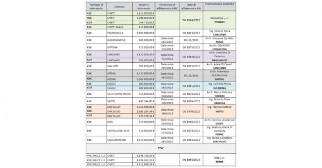 Dovranno progettare 3 ospedali di Comunità (Chieti, Atessa, San Salvo), 11 case di Comunità (Chieti città e allo Scalo, Francavilla, Guardiagrele, Ortona, Lanciano, San Vito, Atessa, Casoli, Villa Santa Maria, Vasto, San Salvo), e 4 Centrali operative territoriali (Lanciano, Casoli, Chieti e San Salvo).