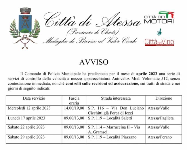 Il comune di Atessa ha pubblicato nei giorni scorsi il calendario dei controlli della velocità che la Polizia municipale ha predisposto nel mese di Aprile 2023.