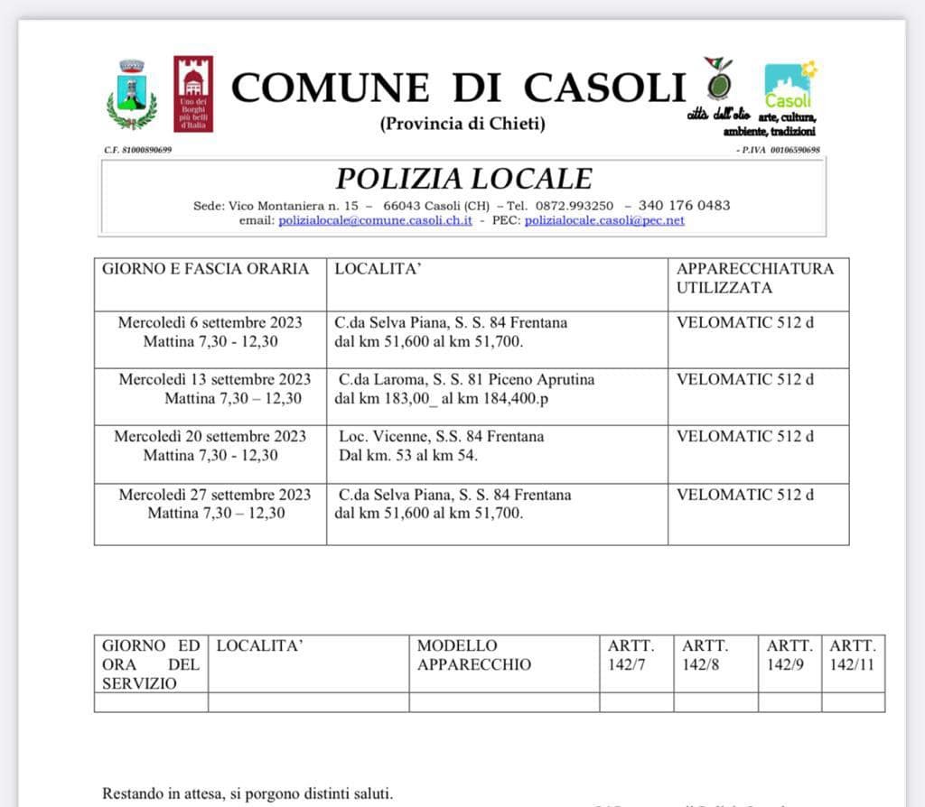 Il comune di Casoli ha pubblicato il calendario dei controlli della velocità , predisposti dalla polizia locale, per il mese di Settembre nel territorio comunale