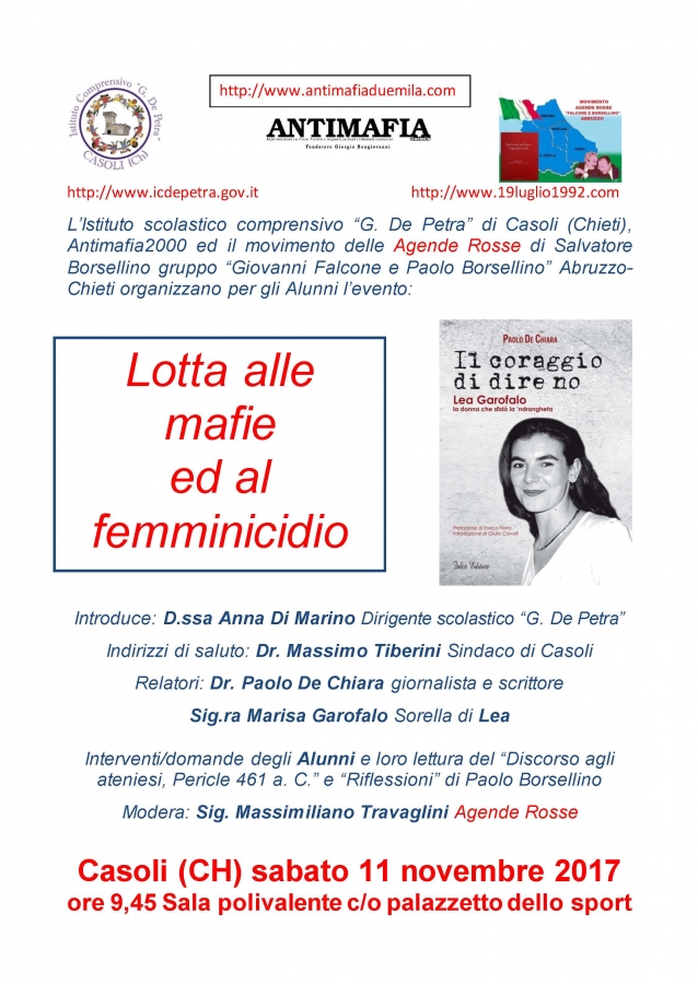 L’Istituto scolastico comprensivo “G. De Petra” di Casoli (Chieti), la rivista on line “Antimafia2000” (www.antimafiaduemila.it) ed il movimento delle Agende Rosse (www.19luglio1992.com) di Salvatore Borsellino gruppo “Giovanni Falcone e Paolo Borsellino” Abruzzo-Chieti, con il patrocinio dei Comuni di Casoli ed Altino, organizzano gli eventi: “Lotta alle mafie ed al femminicidio. Il coraggio di dire no. Lea Garofalo la donna che sfidò la ‘ndrangheta”.