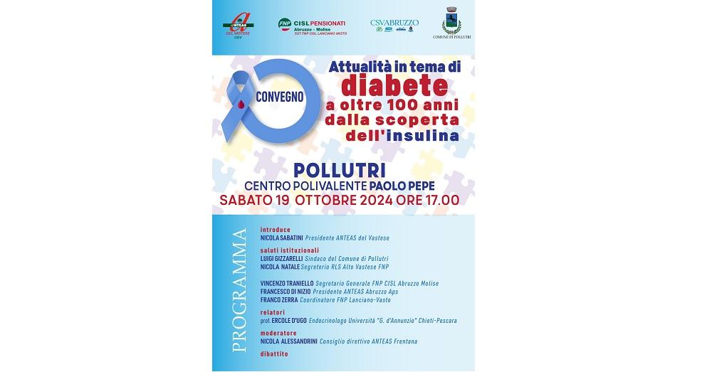 Sabato 19 ottobre alle ore 17.00, presso il Centro Polifunzionale "Paolo Pepe" di Pollutri, è in programma un interessante convegno sul diabete.