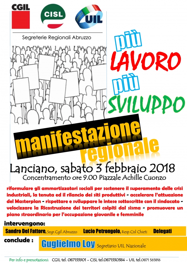 Su lavoro e crescita economica in Abruzzo si deve e si può fare di più. È quanto ribadiranno Cgil, Cisl e Uil sabato 3 febbraio nel corso della manifestazione unitaria regionale "Più lavoro più sviluppo per l'Abruzzo" che si svolgerà a Lanciano con un corteo che da piazzale Cuonzo terminerà in piazza dei Frentani. In caso di pioggia, l'iniziativa si svolgerà interamente nel Teatro Fedele Fenaroli.