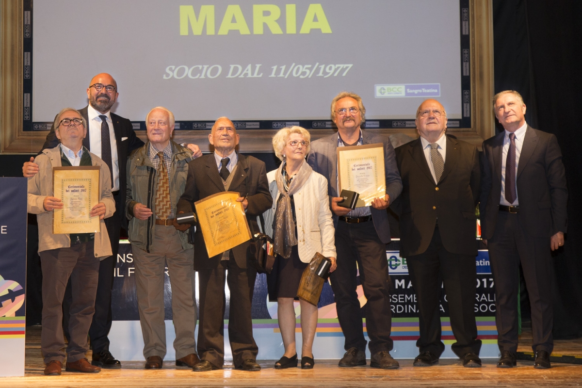 L'assemblea si è conclusa con il consueto Cerimoniale dei Valori. Sono stati così premiati i soci da più quarant'anni: Benito Fidelibus, Nicola Giannico, Rino Falasca, Tonino Pezzella e Maria Tumini. Consegnati anche i Premi allo studio ad Alberto D'Ettore, laurea in Chimica e Tecnologia Farmaceutica con 110 e lode, Giuseppe Dispoto, diploma in Informatica e telecomunicazioni con 100, Maria Felicia Terzano, laurea magistrale in Imprenditorialità e innovazione con 110 e lode, Alessandro Biasone, diploma Chimica e Materiali con 100, Costantina Caravatta, laurea in Giurisprudenza con 110 e lode, Michela Milanese, laurea magistrale in Scienze storiche con 110 e lode, Cristina Di Franco, laurea magistrale in Beni culturali con 110 e lode, Luigi Menna laurea in Ingegner Edile e Architettura con 110, Franco Mastronardi, laurea magistrale in Servizio sociale e Politiche sociali con 110 e lode, Lidia Gargarella, maturità Socio-Psico-Pedagogico con 100. I Bonus Bebè sono andati ai piccoli Elia Bocchi, Sara Buccella, Daphne D'Alò, Giorgia D'Ardes, Maria Vittoria Di Marco, Sofia Di Nenno, Luca Fidelibus, Giulia Finamore, Benedetta Gargarella, Sura Giannico, Aurora Mastronardi, Nausica Norante, Diego Palena, Nicola Mario Carmosino, Nicola Pietro Salvatore, Asia Carlucci, Nicolas Di Rico, Manolo Di Nardo, Marianna Teti, Martina Di Rienzo. Consegnati, infine, i riconoscimenti ai dipendenti della banca da più di venticinque anni: Concetta Marcucci, Silvia Pellicciotta, Lucia Tinaro, Dionisio Perazzelli, Filomena Sassano.