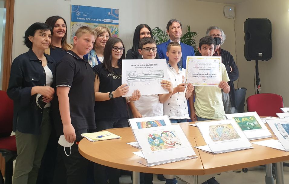 La premiazione, questa mattina, a L'Aquila, nella filiale della sede della Banca d'Italia. La classe quinta, accompagnata dalle docenti Rita Pasquini, Paola Cannarozzo e dalla Dirigente Lara Di Luigi, è stata premiata come finalista della fase interregionale del concorso "Inventiamo una banconota"; attraverso la competizione si è richiesto ai ragazzi di progettare “la loro banconota immaginaria”, e tema di quest’anno “la ripartenza post covid”, e non solo in chiave economica.