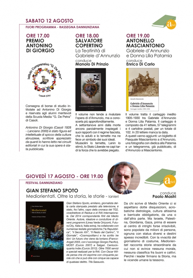 Nello stesso pomeriggio del 12 agosto, al Castello Ducale si svolgeranno altri due eventi: alle ore 17 verranno assegnate le borse di studio agli alunni meritevoli della locale Scuola Media “G. De Petra” nell’ambito del Premio “Antonino Di Giorgio” – Di Giorgio, nato a Casoli nel 1928 e morto a Lanciano nel 2000, è stato intellettuale di spicco della cultura abruzzese, scrittore apprezzato da quanti lo hanno letto nei circuiti editoriali in cui la sua opera è stata pubblicata.