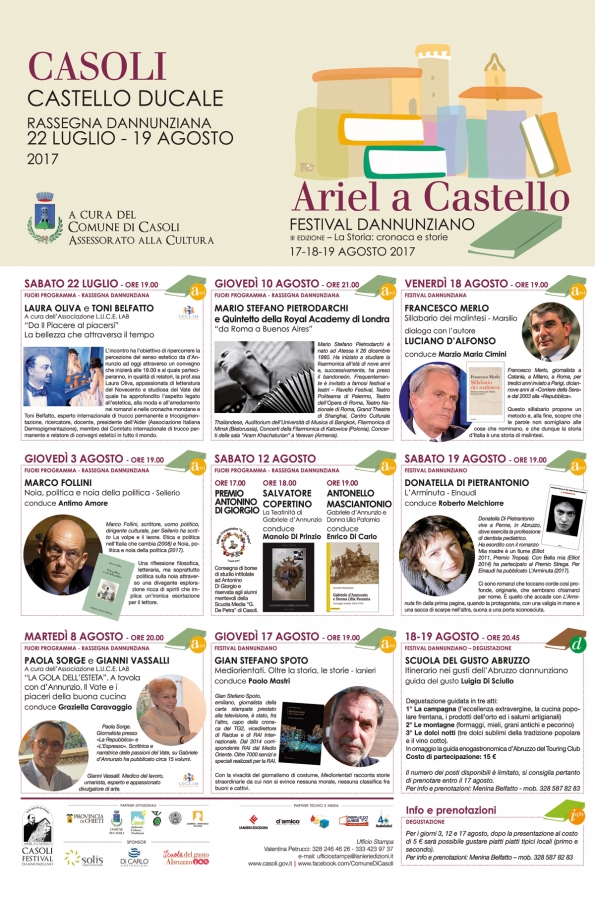 CASOLI - Sabato 12 agosto, in attesa della terza edizione del Festival Dannunziano “Ariel a Castello” che si svolgerà dal 17 al 19 agosto, il Comune e l’Assessorato alla Cultura punteranno i riflettori sui rapporti tra il Vate e la realtà casolana nell’ultimo degli appuntamenti fuori programma della manifestazione.
