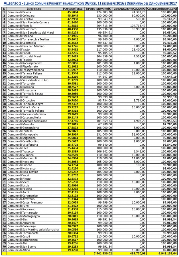 Per completezza espositiva, si riporta di seguito l'elenco dei Comuni finanziati (tutti per l'importo di circa 100mila euro - per il dettaglio vedasi graduatoria allegata - per un investimento complessivo pari a circa 7.5 milioni di euro): Canistro, San Pio delle Camere, San Benedetto dei Marsi, Capistrello, Luco dei Marsi, Ortucchio, Scurcola Marsicana, Trasacco, Sulmona, Pescina, Avezzano, Roccaraso, Collelongo, Tornimparte, in provincia di L'Aquila; Palena, Palombaro, Torrevecchia Teatina, Fara San Martino, Vasto, Roccaspinalveti, Pizzoferrato, Fresagrandinaria, Taranta Peligna, Fossacesia, Frisa, Villa Santa Maria, Torricella Peligna, Roccamontepiano, Casacanditella, Torino di Sangro, Gessopalena, Lentella, Miglianico, Casalbordino, Villalfonsina, Montazzoli, Cupello, Ripa Teatina, Vacri, Filetto, Scerni, Liscia, Archi, Castel Frentano, Furci, Tornareccio, Mozzagrogna, Gissi, San Martino sulla Marrucina, Casoli, Bucchianico, San Buono e Altino, in provincia di Chieti; Pianella, Picciano, Popoli, Collecorvino, San Valentino in A.C., Rosciano, Moscufo, Manoppello, Elice, Nocciano e Caramanico Terme, in provincia di Pescara; Colledara, Tossicia, Tortoreto, Notaresco, Ancarano e Atri, in provincia di Teramo.