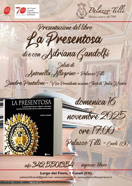 Raccontare la storia abruzzese attraverso un gioiello. È il filo narrativo che attraversa il libro "La Presentosa" (ed. Radici), che sarà presentato domenica 16 novembre, alle 17, a Palazzo Tilli di Casoli dall'antropologa Adriana Gandolfi, che ne è l'autrice. L'iniziativa è promossa dalla sezione di Chieti di Italia Nostra in collaborazione con Palazzo Tilli e vedrà la partecipazione della vicepresidente dell'associazione Sara Pantalone e di Antonella Allegrino, proprietaria dell'edificio settecentesco. La Presentosa, gioiello barocco creato nel Settecento, divenne celebre anche grazie a Gabriele D'Annunzio, che lo descrisse in "Trionfo della morte" (1894), contribuendo a consolidarne il nome e il fascino.