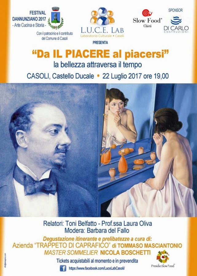 CASOLI – “Da ‘Il Piacere’ al piacersi- La bellezza che attraversa il tempo”, questo il titolo dell’evento organizzato dal laboratorio culturale Luce Lab con il patrocinio di Slow Food Chietie il contributo del Comune di Casoli che si terrà sabato 22 luglio al Castello Ducale di Casoli.