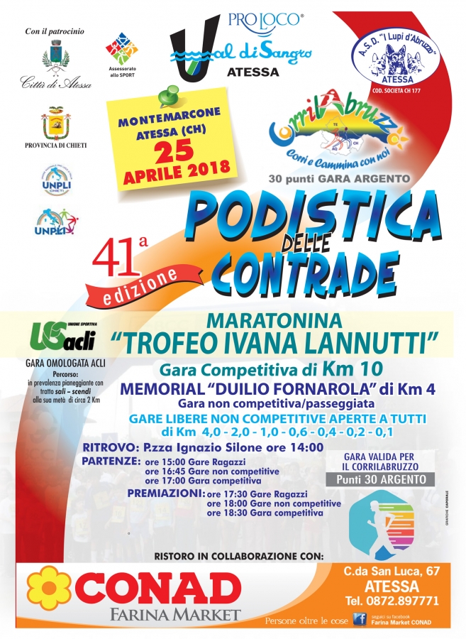 Anche quest’anno il 25 aprile la Podistica delle Contrade, 41° edizione per l'evento promosso dalla Pro Loco Val di Sangro, in collaborazione con A.S.D I Lupi d’Abruzzo patrocinata dal Comune di Atessa e dall’Assessorato allo Sport e dalla Provincia di Chieti.