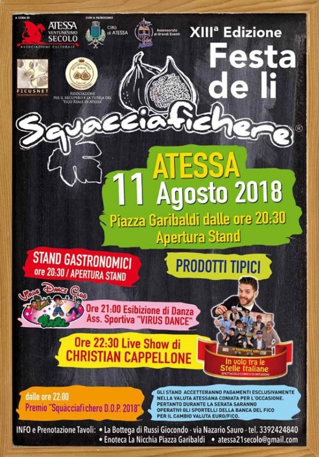 Alle 21.00 l’intrattenimento con l’Associazione Sportiva Virus Dance e con la comicità di Cristian Cappellone a partire dalle ore 22.00. Immancabile anche la consegna del premio “Squacciafichero D.O.P. 2018” al personaggio che si è contraddistinto per aver portato il nome di Atessa al di fuori del proprio territorio.