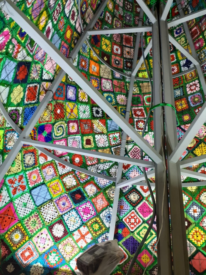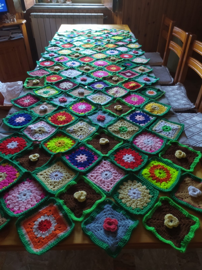 L’associazione agli inizi di settembre ha fornito alle signore i gomitoli di filo acrilico, la lana all’aperto è soggetta al deterioramento, con cui ricamare all’uncinetto le pezze. La ricamatura, iniziata agli inizi di settembre, ha portato alla tessitura di 1200 pezzoline già a fine ottobre.