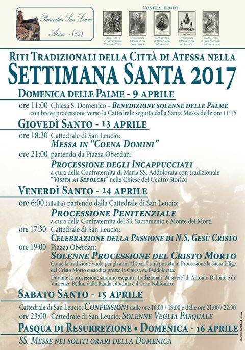 Nel Venerdì Santo, 14 aprile, all’alba alle ore 6.00 sarà celebrata la Processione Penitenziale a cura della Confraternita del SS. Sacramento e Monte dei Morti. Nel pomeriggio alle 17.30 nella Cattedrale di San Leucio sarà celebrato la Passione di Nostro Signore Gesù, al termine della quale, alle ore 19.00 da Piazza Oberdan i fedeli si riuniranno per la Solenne Processione del Cristo Morto.