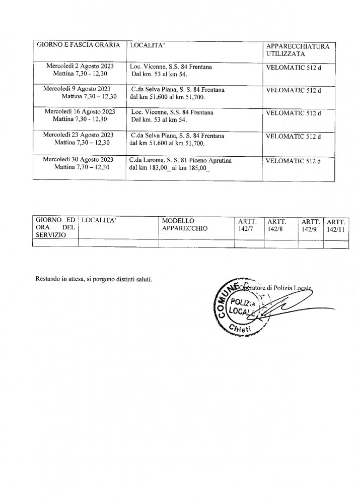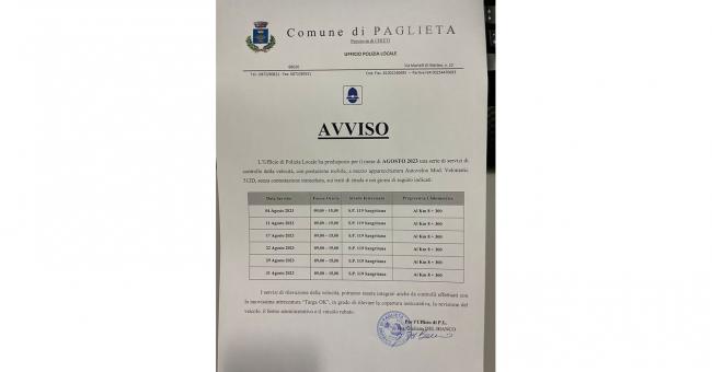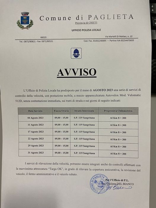 Il comune di Paglieta ha pubblicato il calendario dei controlli della velocità che la Polizia municipale ha predisposto nel mese di Agosto 2023 sulla S.P. 119 Sangritana.
