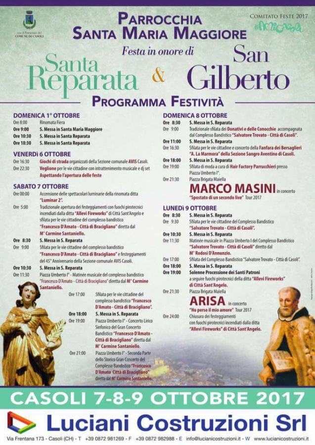 CASOLI – tutto pronto per la tradizione delle feste patronali in onore di Santa Reparata e San Gilberto nei giorni del 7, 8 e 9 ottobre. Già dalla notte di oggi si attenderà l’accensione delle luminarie e l’apertura ufficiale dei festeggiamenti intensi per tutta la cittadina.