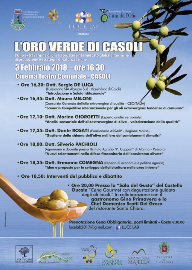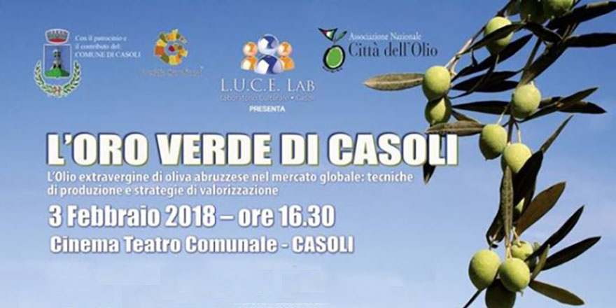 CASOLI - Tutto pronto per il nuovo appuntamento organizzato da L.U.C.E Lab con il patrocinio del Comune di Casoli interamente dedicato all’olio extravergine d’oliva. Il seminario, dal titolo “L’oro verde di Casoli”, si terrà sabato 3 febbraio al Cinema Teatro Comunale di Casoli (Ch) e vedrà la partecipazione di esperti del settore provenienti da tutta Italia.