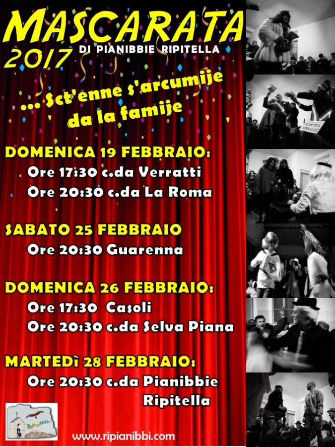 La Mascarata di carnevale di Pianibbie Ripitella è una tradizione casolana del periodo di Carnevale. Si tratta di uno spettacolo di commedia popolare tratto da fatti di vita reale, messe in scena da un gruppo di attori esclusivamente maschi con travestimenti particolari. Primo appuntamento in contrada Verratti (17,30) e contrada La Roma (20,30).